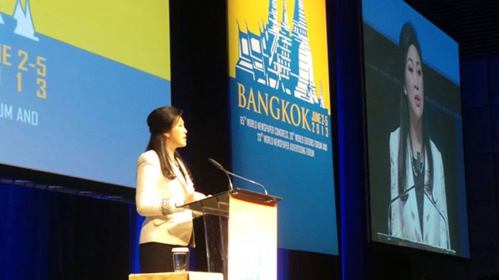 ดิฉันขอต้อนรับและขอขอบคุณที่ทุกท่านเชื่อมั่นในประเทศไทย WAN-IFRA นั้นเป็นองค์กรที่มีความสำคัญและมีอิทธิพลสูง ดิฉันจึงภูมิใจที่ประเทศไทยได้รับโอกาสเป็นเจ้าภาพจัดงานในครั้งนี้
