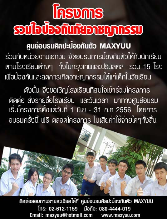 ตอนนี้ทางโรงเรียนสอนศิลปะป้องกันตัว MAXYUU ได้จัดโครงการ รวมใจป้องกันภัยอาชญากรรม เพื่อที่จะจัดอบรมและสอนวิธีการป้องกันตัวเบื้องต้นให้กับน้องๆนักเรียนนักศึกษาในเขตกรุงเทพและปริมณฑล เพื่อที่จะช่วยกันกันป้องกันและลดความเสี่ยงในการเสียชีวิตจากการถูกทำร้าย การปล้น และจากเหตุสุดวิสัยที่อาจจะเกิดขึ้นได้ตลอดเวลา จึงอยากขอแรงจากพี่น้องๆ ชาวพันทิพย์ ช่วยกระจายข่าว ประชาสัมพันธ์ ไปถึงคนที่รู้จักหรือที่ทำงานในโรงเรียนต่างๆในกรุงเทพ โครงการนี้ทางโรงเรียนที่สนใจสามารถติดต่อขอรับการอบรมได้ฟรี ไม่มีค่าใช้จ่ายใดๆ ทั้งสิ้น ตลอดโครงการ โครงการจะเริ่มตั้งแต่วันที่ 1 มิย - 31 กค 56 รวมทั้งสิ้น 15 โรงเรียน ตรงนี้อาจจะจำกัดโรงเรียนไว้ที่ 15 โรงเรียนนะครับ เนื่องจากโครงการนี้ ค่าใช้จ่ายทั้งหมดเป็นเงินส่วนตัว ต้องขออภัยมา ณ ที่นี้ด้วย หากถ้าทางโรงเรียนไหนติดต่อเข้ามาตั้งแต่ โรงเรียนที่ 16 ไป นะครับ