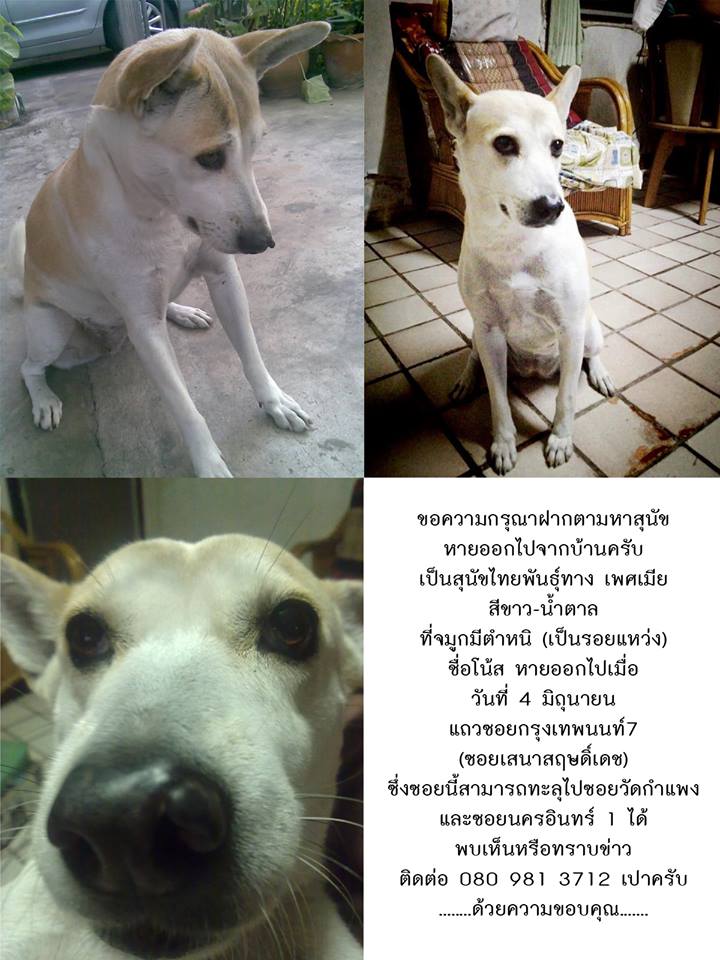 หากใครพบเห็นสุนัขพันธุ์ทางเพศเมียสีขาว-น้ำตาลอ่อน จมูกมีรอยตำหนิเล็กน้อย และเราเรียกมันว่า "ฮาโน้ส" ได้หายไปจากบ้านเมื่อเช้าวันที่ 4 มิถุนายน แถวซอยกรุงเทพ-นนท์ 7 (ซอยเสนาสฤษดิ์เดช) ซึ่งซอยนี้สามารถทะลุไปซอยวัดกำแพงและถนนนครอินทร์ 1 ได้ หากพบเห็นหรือทราบข่าวติดต่อเบอร์ในรูปภาพหรือโพสต์หาเจ้าของกระทู้ได้เลยค่ะ ช่วยกันแชร์หน่อยนะคะ ตอนนี้แฟนเจ้าของหมาก็ทุกข์ใจไม่แพ้กันค่ะ ขอบคุณทุกท่านในความช่วยเหลือล่วงหน้านะคะ ขออธิษฐานให้ผลบุญของทุกท่านจากการช่วยเหลือครั้งนี้ ช่วยให้เพื่อนๆ ทั้งหลายไม่พลัดพรากจากคนที่รักนะคะ T________T