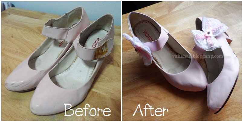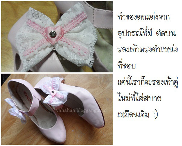 สวัสดีค่ะ วันนี้มีงาน DIY ง่ายๆ ที่ทำเสร็จซักพัก(พักใหญ่มากกกก)มาแชร์ ไปดู before after กันก่อนเลย หลังจากเช็ดถูสุดฤทธิ์แล้ว สภาพก็ยังเยินอย่างที่เห็น ที่จริงมันจะมีโบว์เน่าๆติดอยู่ด้วย แต่เราดึงทิ้งไปแล้วลืมถ่ายเก็บไว้ บางคนอาจจะคิดว่า หลังทำมันก็ไม่ได้ต่างจากตอนแรกเท่าไหร่มั้ง แต่มันด็ดูดีขึ้นมากอ่ะ ชิมิ? คือตอนเราจะทำ เราก็คิดว่าอยากจะเปลี่ยนแนวมันออกไปเลยเหมือนกันนะ ทำทั้งที แต่เราอยากได้สีเดิม สไตล์เดิมอ่ะ เพราะคู่นี้ซื้อมือสองมาร้อยเดียว มันใสสบายไม่ปวดเท้าดี ก็เลยไม่อยากซื้อใหม่ เพราะเน้นสีเดิม มันเลยไม่ยุ่งยากเท่าไหร่ แค่ทำให้มันดูใหม่และน่ารักขึ้นเอง เริ่มทำกันเลยดีกว่าเนอะ วิธีง่ายๆ ที่ทุกคนก็ทำได้ หวังว่าจะเป็นประโยชน์กับหลายๆคนนะคะ