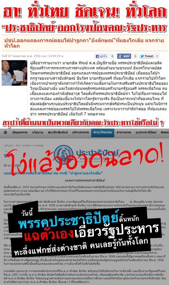 ตั้งทู้ด้วยภาพอีกสักภาพฮับ..."ฮาทั่วไทย ชัดเจนทั่วโลก ประชาธิปัตย์ออกโรงปกป้องคณะรัฐประหาร" ดูผ่านๆแล้ว "เท่" จุงเบย