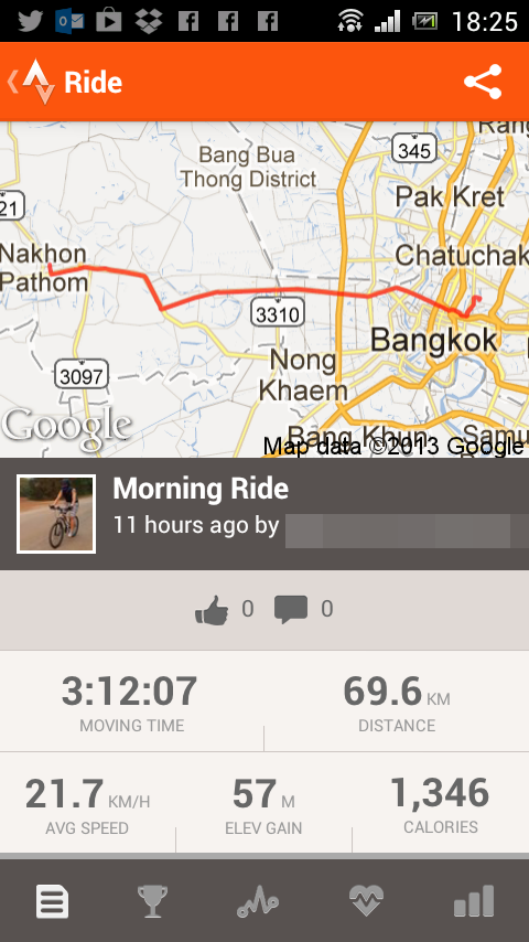 จากนั้นก็วิ่งยาวจนถึงหน้ามหาวิยาลัยมหิดลศาลายา จากนั้นแรงเริ่มตก ก็แวะกินข้าวกินน้ำกินขนมและพยายามเลี้ยงรอบขาให้ความเร็วไม่ต่ำกว่า 20 กิโลเมตรต่อชั่วโมงครับ
