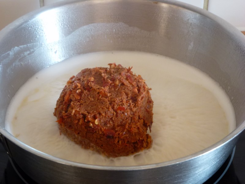 เสร็จแล้วตั้งกะทิให้ร้อน แล้วใส่เครื่องที่โขลกลงไป ตั้งให้เดือด เคี่ยวจนกะทิเข้นแบบนี้