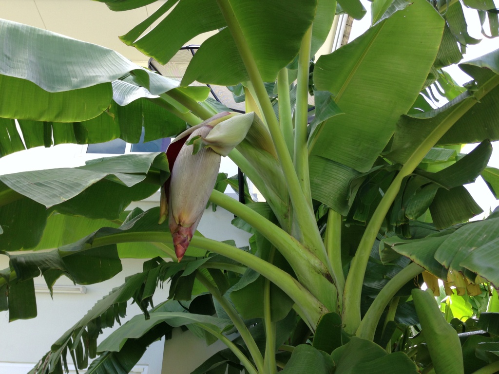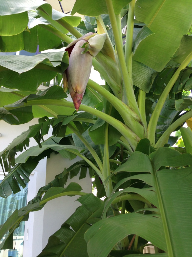 กล้วยต้นนี้ เป็นกล้วยขึ้นเสาเอก ปลูกมาสองปี ต้นสูงมาก ใหญ่และงามมาก แต่เพิ่งจะออกดอก รอลุ้นกัน ว่าเป็นกล้วยอะไร แต่ใจผมว่าเป็น กล้วน้ำว้าแหง๋มๆ