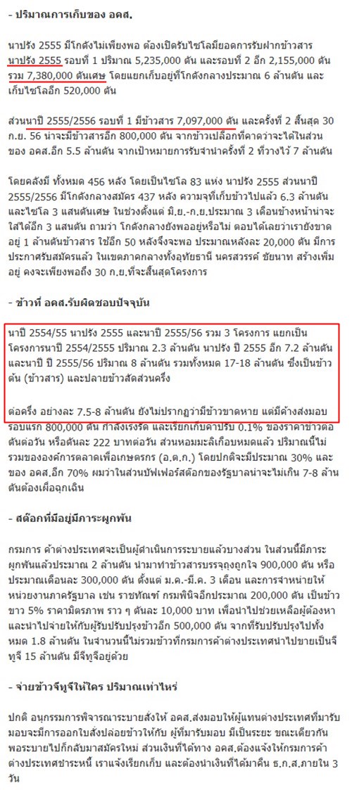 หรือมีข้าวอยู่ในความรับผิดชอบของอคส.ตั้งแต่เริ่มโครงการ ไม่น่าเกิน 20 ล้านตัน และน่าจะเป็นปลายข้าวไม่เกิน 6 ล้านตัน