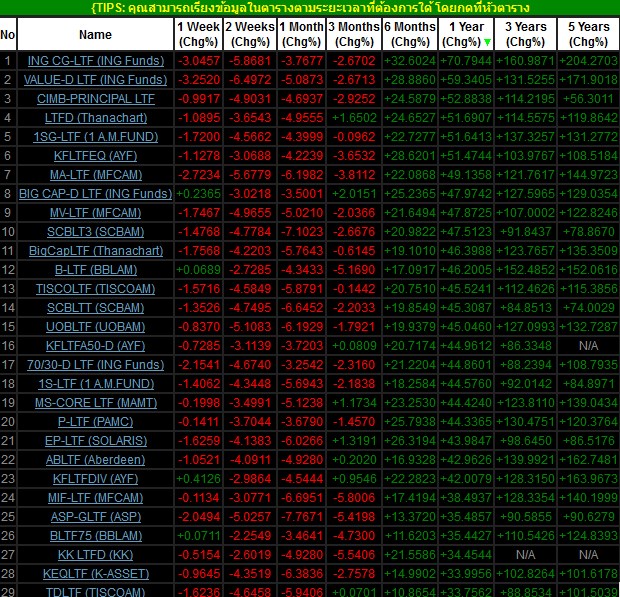 ถ้าดูจากชาร์ต ING-CG LTF นี่ผลงานดีที่สุดใช่ไหมครับ (ชาร์ตนี้เค้าเรียงลำดับยังไง ยังงงๆยึดเอาอะไรเป็นหลักเพราะผลประกอบการมันมีหลายระยะเวลา) แต่เวลาลงก็ดูจะลงเยอะสุดเหมือนกัน ถ้าจังหวะนี้ เลือกตัวไหนดีครับ จริงๆมอง LTFD ของธนชาตไว้เหมือนกัน ดูตอนลงจะลงน้อยกว่าตลาด แต่ตอนขึ้นอาจจะสู้ ING-CG-LTF ไม่ได้ (อีกอย่างเคยซื้อกับธนชาตปีก่อน สะดวกซื้อผ่านเน็ตได้)