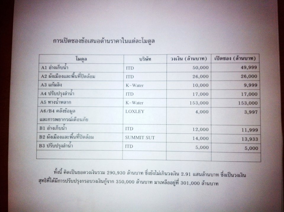 งานประมูลโครงการน้ำ 9 กลุ่มโมดูล 4 บริษัท A1 อ่างเก็บน้ำ กลุ่มบริษัท ITD ประมูลได้ 49.999 จากที่รัฐบาลตั้งไว้ 50,000 ล้านบาท A2 ผังเมือง กลุ่มบริษัท ITD ประมูลได้ 26,000 พอดีกับที่รัฐบาลตั้งไว้ A3 แก