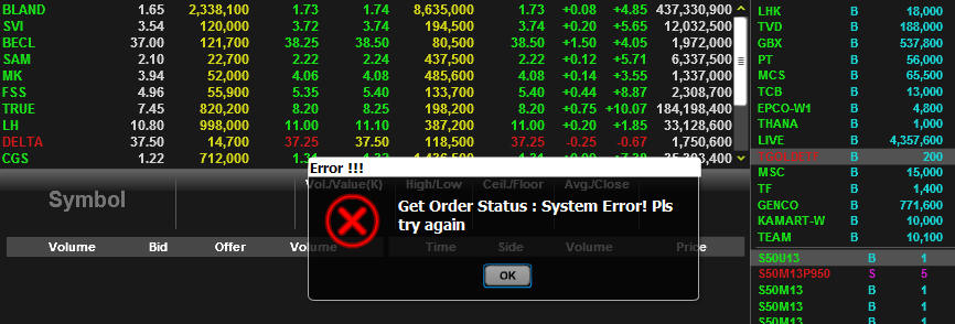 ไม่รู้ผมเป็นคนเดียวหรือเปล่านะครับ ตั้งแต่เมื่ออาทิตย์ที่แล้วที่ดูเหมือน BLS จะเกิดอะไรขึ้นสักอย่างกับการส่งคำสั่งซื้อขายผ่านหน้าเว็บของ BLS แต่ปกติผมส่งคำสั่งผ่านทาง Streaming Pro อยู่แล้วเลยไม่มีปัญ