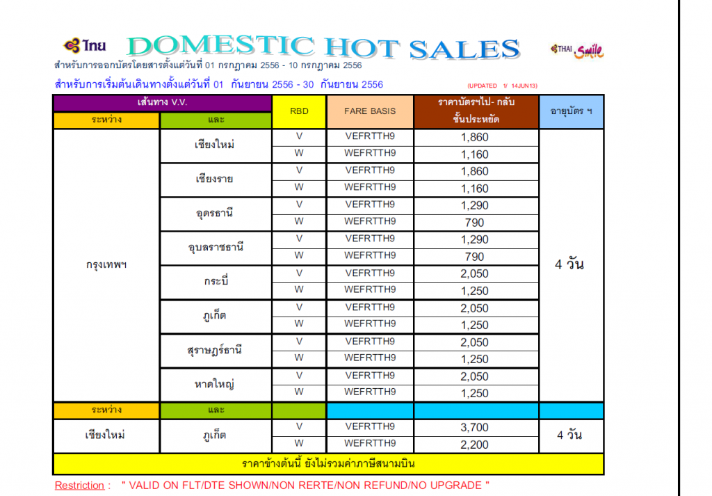 1.  ราคาพิเศษนี้ สำหรับการเดินทางไป-กลับ บน ชั้นประหยัด ในเส้นทางที่กำหนดด้วยเที่ยวบิน การบินไทย และ การบินไทยสมายล์ เท่านั้น