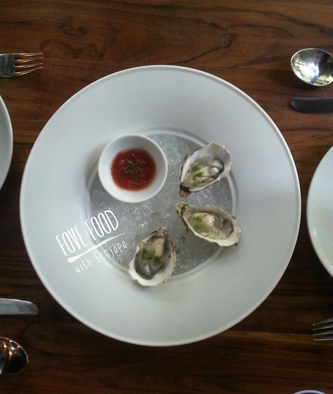 จานที่หนึ่งเป็น Oyster สด(จาก Scandinavian อะไรเทือกนั้น จำไม่ได้) คือเวลาเบนสั่ง เบนพยายามจะเลือกจากจานที่มีรสชาติอ่อนและ Delicate มากสุด เพื่อที่จะให้ได้รับรสชาติของอาหารทุกจานมากสุดเท่าที่มันควรจะเป็น
