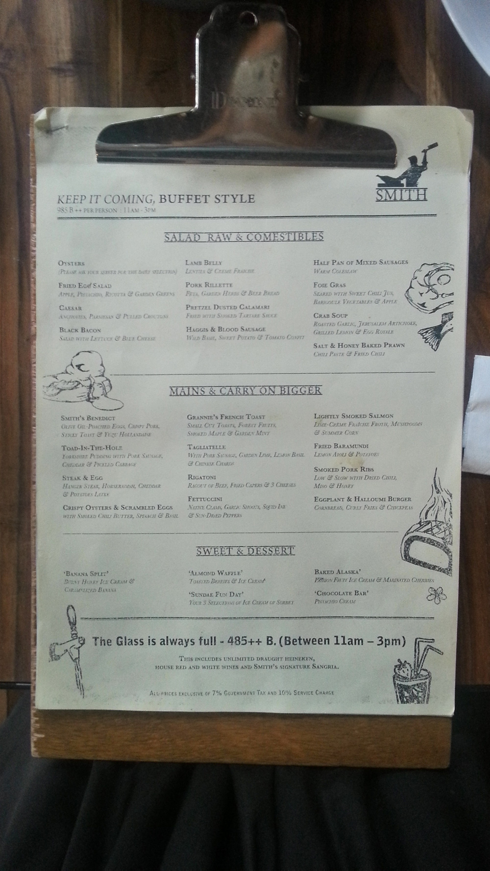 ร้านนี้ weekday จะเปิดแค่เฉพาะตอนกลางคืน เป็นร้านนั่งดื่มด้วย ส่วน weekend นั้นจะเปิดตอนเที่ยงด้วย แล้วเค้าก็มี Buffet Brunch ตอนแรกเบนไม่ได้ดูราคา แค่อ่าน Menu เฉยๆ แต่ละเมนูฟังดูน่ากินมาก ที่นี้เค้าไม่ได้เป็นแบบเดินตักเหมือนโรงแรม แต่ว่าให้เลือกเป็นจานๆแล้วก็เอามาเสิร์ฟให้ที่โต๊ะ ซึ่งเบน prefer แบบนี้มากกว่า นั่งสบายๆ ไม่ต้องไปแย่งอาหารกับใคร พอดูราคา เฮย!!!! แค่ 985++ บาท เองหรอ มันถูกไปรึเปล่า อ่านเมนูแล้ว มันดูน่าจะแพงกว่านั้นนะ แล้วร้านก็ดูดี(ถึงจะมืดไปหน่อยก็เถอะ) ปกติกิน Buffet มันราคาแพงกว่านี้ตั้งเยอะ เบนเชื่อว่า You get what you pay คือถ้าเป็น Buffet โรงแรม แล้วราคาต่ำกว่า 1,800 บาท ก็แบบอืม............. กินที่อื่นดีกว่า
