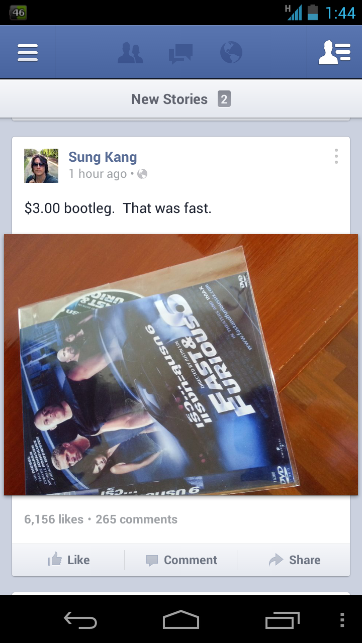 Sung Kang หรือ ฮาน ในหนังดัง Fast6 มาเที่ยวเมืองไทย อาจจะมาเยี่ยมพี่ชายและหลานๆในประเทศไทย ซุงได้ซื้อแผ่น DVD Fast6 แผ่นผี หนังที่ซุงแสดงเป็น ฮาน อันนี้รู้จักกันดี ซุงโพสว่า $3.00 bootleg. That was