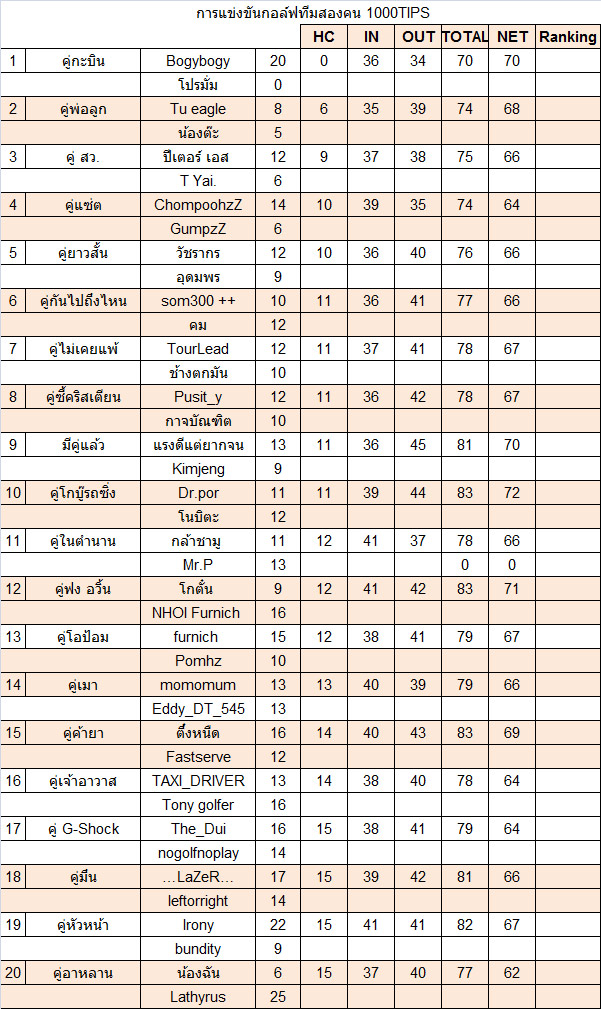 ผลการแข่งขันแม็ตประจำเดือน 1000TIPS กอล์ฟทีมสองคน ได้แก่