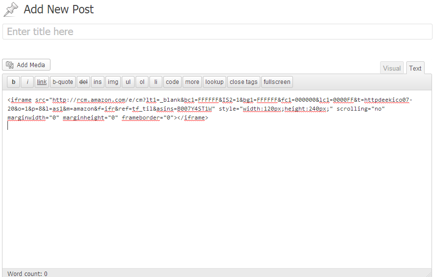 เพิ่งลองโพสครั้งแรกก็ไม่ได้เลยครับ ผมลง Wordpressล่าสุด3.5.1 เข้าไปก๊อบโค้ดที่ Amazon แล้วมาวางใว้ที่ แท็บ Text ในAdd New Post