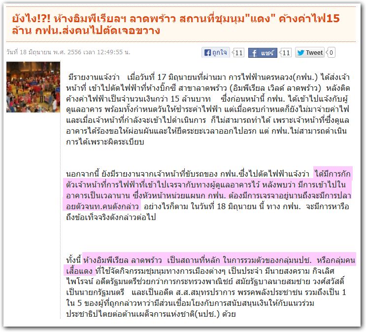 ห้างอิมพีเรียล เวิลด์ ลาดพร้าวเตรียมฟ้องกฟน.ส่งคนขู่ตัดไฟ "แดง"ยันจ่ายค่าไฟครบ