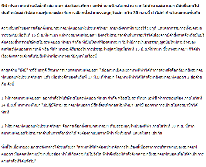 จากมติชนออนไลน์ ภายหลังจาก สหพันธ์ฟุตบอลนานาชาติ หรือ ฟีฟ่า ส่งหนังสือถึง สมาคมฟุตบอลฯ ให้ บริษัท พัทยา จำกัด ถอนฟ้องที่ไม่ให้นำธรรมนูญใหม่มาลงมติรับรองในการประชุมใหญ่สามัญ เมื่อวันที่ 15 มิ.ย.ที่ผ่า
