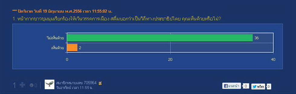บัดนี้ ได้โอกาสอันควรแล้วจึงได้ทำการเปิดผลโพล ผลปรากฏว่ามีผู้ไม่เห็นด้วย 36 ท่าน เห็นด้วย 2 ท่าน