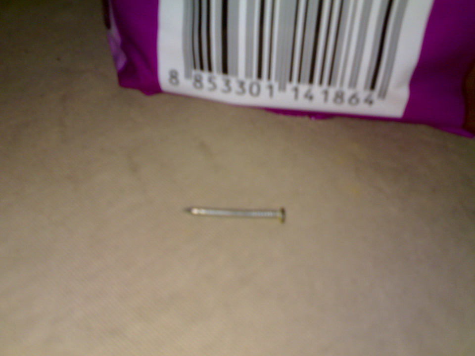 วันนี้ตอนใส่อาหารให้กับเจ้าเหมียว ขณะเทใส่ชามเจอตะปูขนาด 1 นิ้วตามรูป ไหลออกมาด้วยใช้มือหยิบออกมา รู้สึกตกใจเหมือนกันหากเราไม่ได้สังเกตุเห็นเสียก่อน เจ้าเหมียวจะเผลอกลืนไปไหม เพื่อน ๆ เทอาหารเม็ดก็ดู ๆ กันด้วย