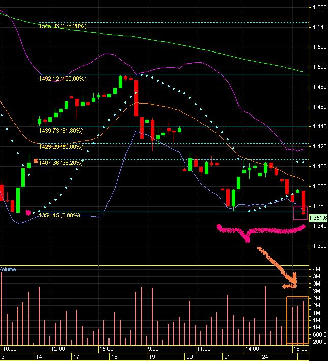 กลับมาดูอีกทีกำลังใจมาแยะเลยครับ ขอบคุณครับ เมื่อกี้จังหวะสำคัญหลุดแนวรับ Doble Top เกิดแรงขายมหาศาลตามมาดังภาพ ถ้าวันนี้ไม่สามารถกลับขึ้นไปยืนเหนือแนวรับที่หลุดลงมาที่ 1351.95 จุดจะทำให้ทิศทางของคลื่นเด้ง c จบลงและเป็นการดำเนินต่อไปของคลื่น A ทิศทางขาลงยังดำเนินต่อไปให้ทุกคนรอการกลับมาของคลื่น B ซึ่งคาดว่าจะกลับมาในช่วงไตรมาส 4 ของปีนี้ (จากที่คาดหวังให้จบขาลงช่วงปลายไตรมาส 3 ต่อต้นไตรมาส 4 อาจต้องมีการปรับแผนใหม่) โดยการลงที่มีวอลุ่มสนับสนุนนั้นเป็นการยืนยันทิศทางที่จะดำเนินไป ในเมื่อพวกเราทุกคนเดินมาตามแผนและทิศทางก็ยังไปตามนั้น พวกเราก็ยังไม่ต้องเปลี่ยนแปลงอะไร (ยกเว้นรอบนี้ผู้เล่น Rebound ควรขายคัทลอสเนื่องจากการ Rebound คลื่น c ไม่เกิดนะครับ)