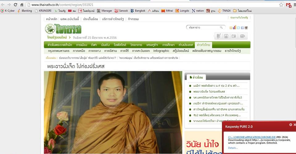 Kaspersky เตือนเลยว่าเจอโทรจันติดมากับเวปไทยรัฐ อีกแล้วครับ ช่วงนี้เวปข่าวโดนบ่อยนะ