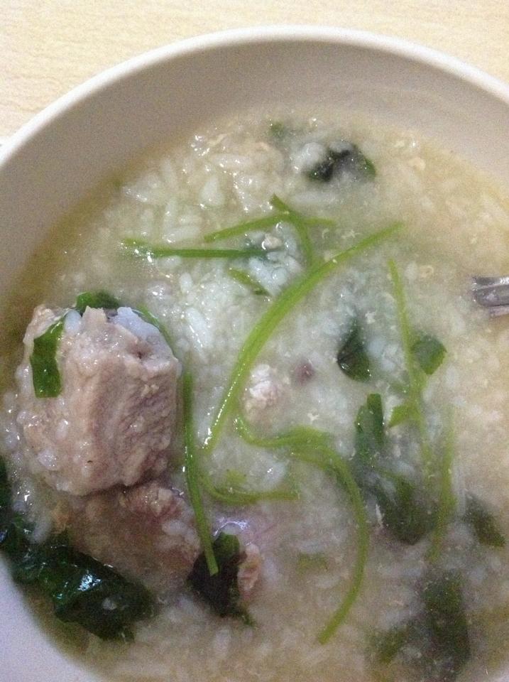 เมนูนี้ ง่ายเลยคะว่า มันคือต้มจืดตำลึงใส่ข้าวนั่นแหละ เริ่มจากต้มน้ำซุ๊ป ใส่กระดูกหมูอ่อน แล้วปรุงรสตามใจชอบใส่ข้าวซึ่งข้าวจะได้เอาไปปั่นให้ละเอียดสักหน่อย เพื่อจะได้ต้มสุกง่ายๆ ไม่ต้องเคี่ยวนาน เอาแค่หมูเปื่อยนิดๆพอ จากนั้นใส่ผักตำลึง เป็นอันเสร็จเรียบร้อย