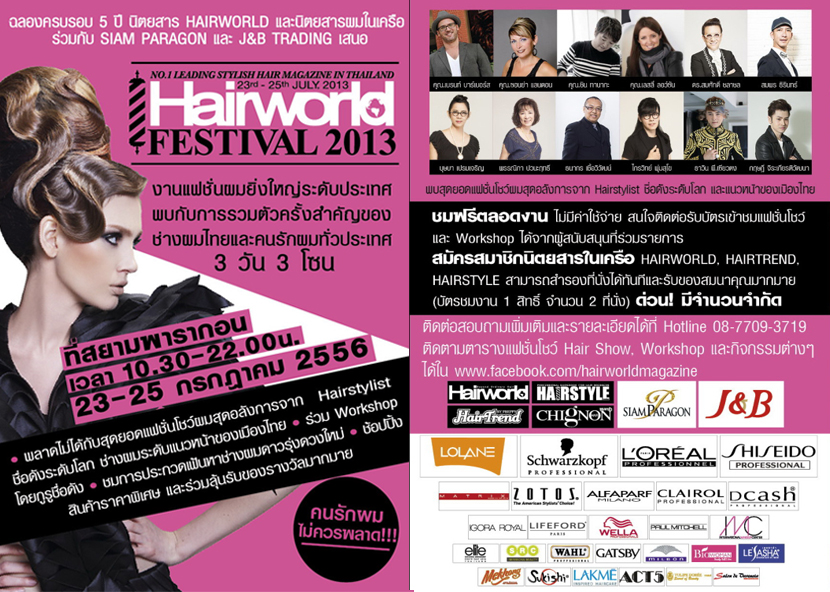 กลับมาสร้างปรากฏการณ์ครั้งสำคัญให้วงการช่างผมไทยได้ตื่นตัวกันอีกครั้ง ร่วมกับห้างสรรพสินค้าสยามพารากอน และบริษัท J&B TRADING ในงาน “HAIRWORLD FESTIVAL 2013” การรวมตัวครั้งยิ่งใหญ่ของวงการแฟชั่นผมในเมืองไทยทุกค่ายทุกแบรนด์ผลิตภัณฑ์ผม ร่วมมือร่วมใจกันประกาศศักดาช่างผมอาชีพของไทย ตลอด 3 วัน 3 โซน ที่สยามพารากอน 23-25 กรกฏาคม 2556 นี้
