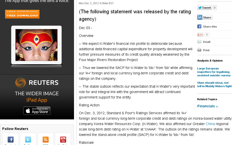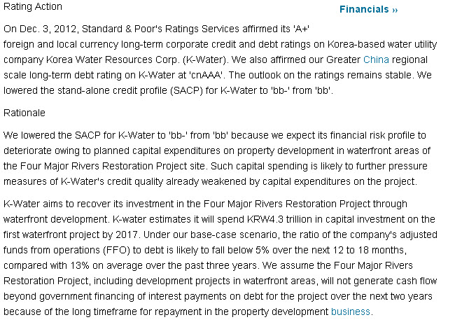 S&P:Ratings on Korea Water A+