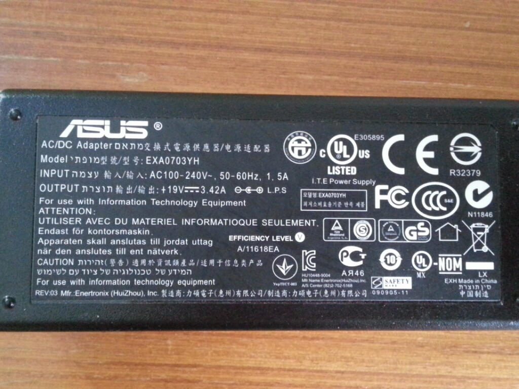 ไม่รู้ว่าสายชาร์ตจริงเป็นสเปคแบบไหน หาข้อมูลเจอจากเว็บ http://www.b2cdigi.com/asus-laptop-ac-adapter/asus-a43s-laptop-ac-adapter-3361.php Features: Input AC 100-240V, 50-60Hz (worldwide use) Output Vo