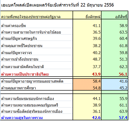 วันที่ 22 มิ.ย. น.ส.ปุณฑรีก์ อิศรางกูร ณ อยุธยา ผู้ช่วยผู้อำนวยการ สำนักวิจัยเอแบคโพลล์ มหาวิทยาลัยอัสสัมชัญ เปิดเผยผลวิจัยเชิงสำรวจ เรื่อง ความแตกต่างของชีวิตความเป็นอยู่ของประชาชนระหว่างสองรัฐบาลและเปรียบเทียบกับยุครัฐบาลของนายกรัฐมนตรีที่ยังมีชีวิตอยู่