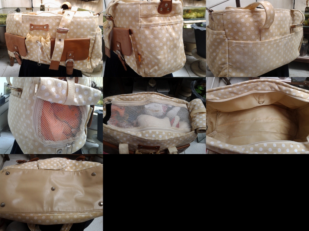 กระเป๋าน้องหมาใบสีครีม เป็นแบบถือและสะพายไหล่ มีตาข่ายระบายอากาศ มีสายรัดปลอกคอ ราคา 150 บาท