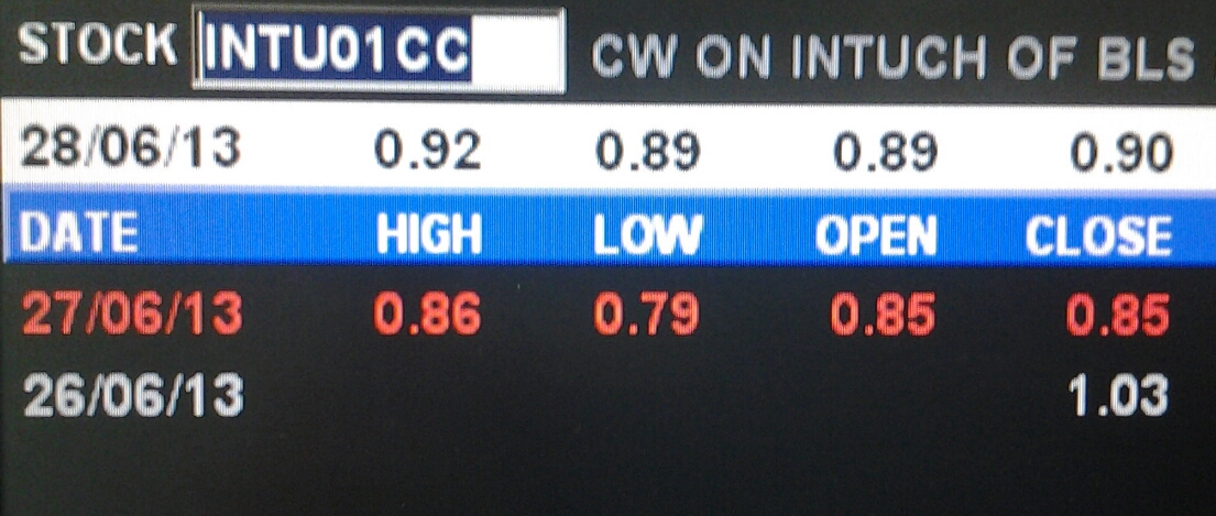 ขอสอบถามหน่อยครับ อย่างDW เช่น INTU01CC เริ่มเทรดวันแรกวันที่27/6/13 แต่ในวันที่26/6/13 มันปรากฏราคาที่ 1.03บาท