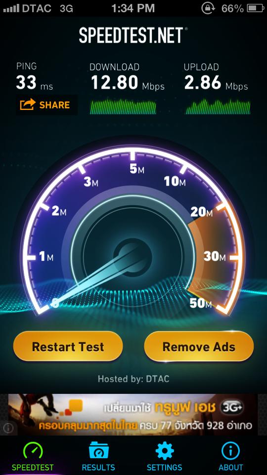 แอบรู้สึกเสียใจนิดๆที่แถวสนามบินน้ำ 3G true ช้า test speed ไม่ถึง 1 Mbps เห็นพี่สาวใช้ AIS ลองแอบเอามา test speed แม่เจ้า!! 30 กว่า Mbps แทบอยากจะย้ายค่ายทันที ของ Dtac ยังไม่เคย test speed แต่คาดว่าน