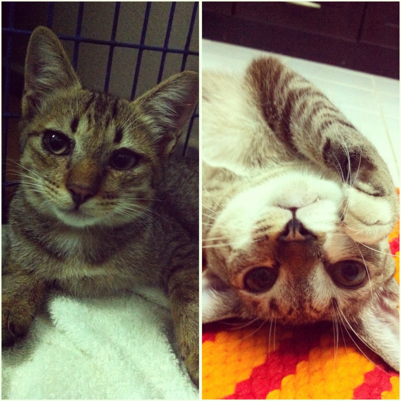 ตั้งชื่อชั่วคราวว่า "พะโล้" (ในรูปคือตัวซ้าย) เพราะที่บ้านมีแมวลายอยู่แล้วชื่อ หนำเลี๊ยบ (ตัวขวา)