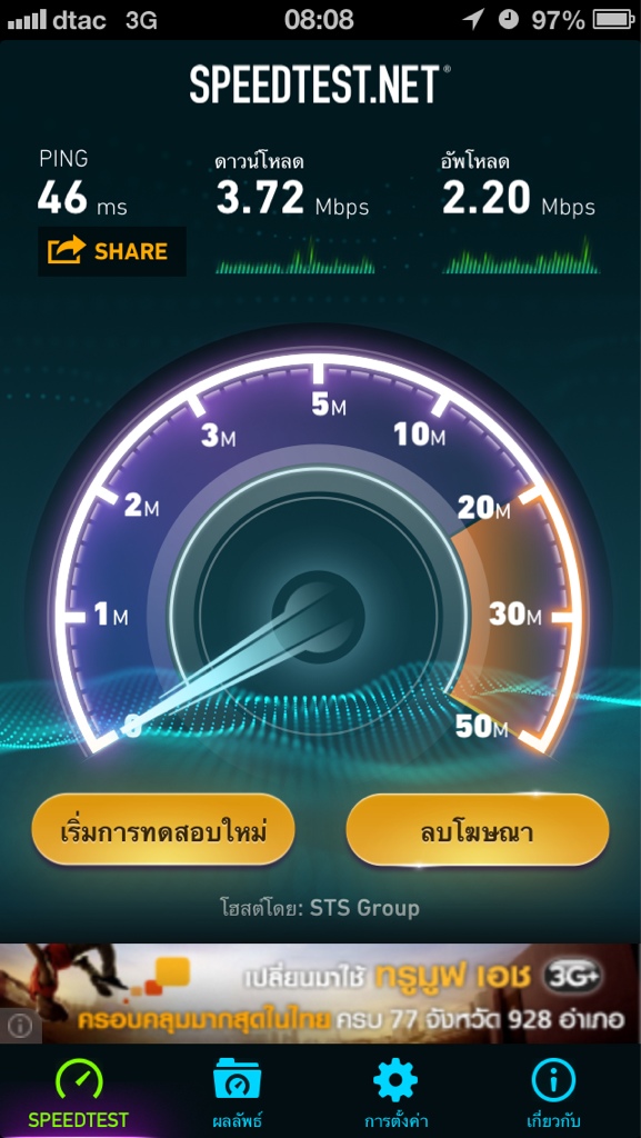 เน็ต AIS แถวแหลมฉบังชลบุรี ช้ามาก ใช้โปร 3G ความเร็วสูงสุด 8 G ความเร็วคงที่ เลยลองเทสสปีดดู มันผิดปกติแล้วละมั้ง เพื่อนใครอยู่แถวแหลมทดสอบเทสมาลงให้ดูบ้างครับ