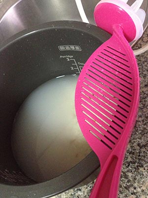 เวลาเทน้ำทิ้ง ก็นำเอาด้านที่เป็นตะแกรงช่องๆ มาวางเข้ากับขอบของหม้อข้าว