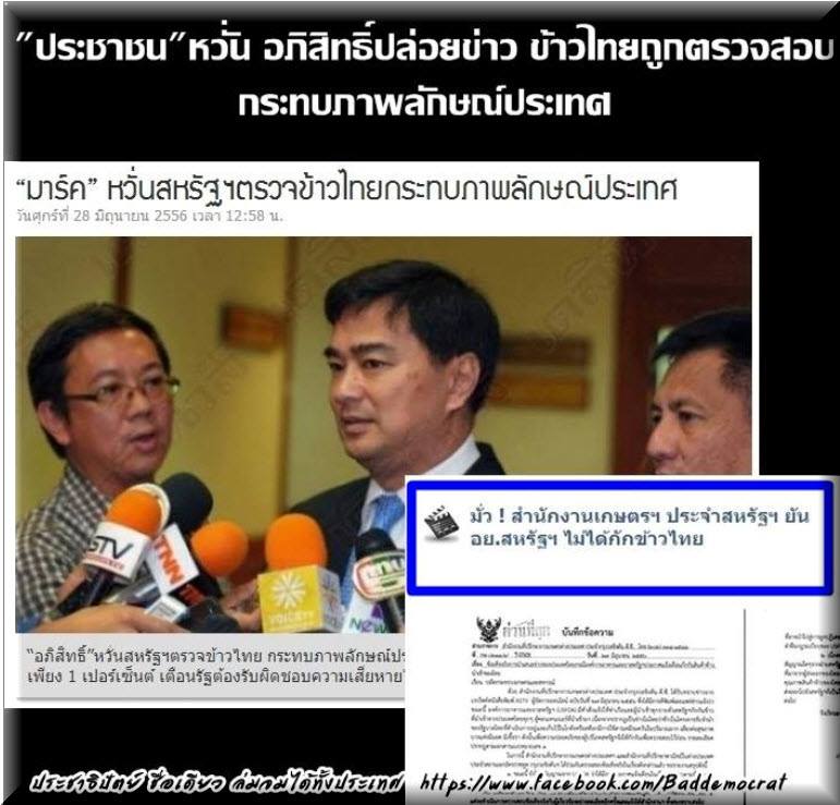 เป็นการพูดที่ขาดจิตสำนึก และขาดความรับผิดชอบต่อประเทศ และประชาชน ทั้งที่สำนักงานคณะกรรมการอาหารและยา (อย.) กรมวิทยา ศาสตร์การแพทย์ ยืนยันผลตรวจวิเคราะห์ข้าวว่าไร้ปัญหาและปลอดภัยได้มาตรฐาน รับประทานได้ ก็ยังปล่อยข่าวว่า อย.สหรัฐสั่งห้ามนำเข้าหรือกักกันข้าวไทย เพราะเกรงว่าข้าวจากโครงการรับจำนำข้าวมีสารเคมีเกินขนาด"