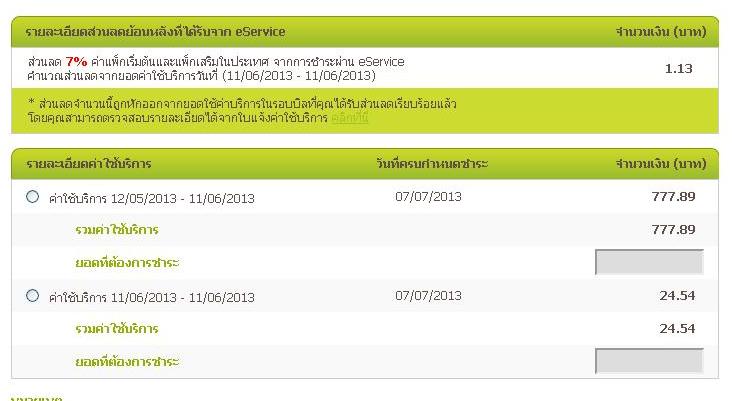 อ้างอิงจากกระทู้เดิม http://pantip.com/topic/30957772 ใบแจ้งรอบบิล 1-31/08/2013 ขึ้นในระบบแล้วนะคะ รายละเอียดดังนี้ค่ะ ค่าแพคเก็จหลัก (399 บาท) คำนวณส่วนลด 7% (5.41 บาท) ภาษีมูลค่าเพิ่ม 7% (27.55 บ