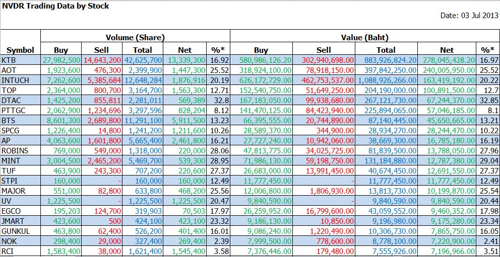 ยอดชื้อขายของ NVDR ประจำวันที่ 3 กรกฎาคม 2556