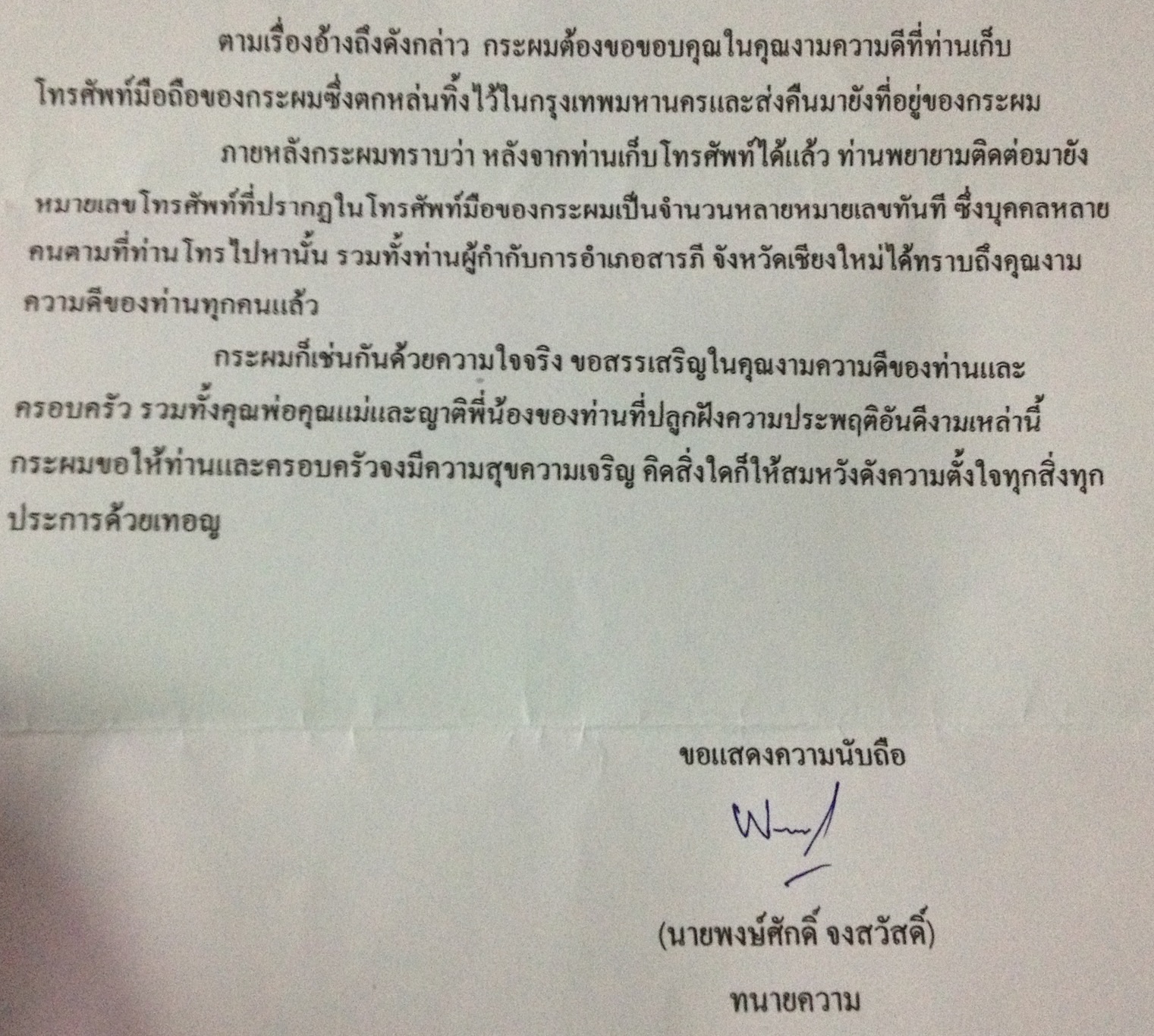 ปลายสายที่รับ เป็นตำรวจยศ ผู้กำกับอะไรสักอย่าง ? จนได้ความว่าเจ้าของเครื่องเปนผู้พิพากษา เค้าแนะนำให้เราเอาโทศัพท์ไปไว้ที่ สน ที่ไกล้ที่สุด เผื่อเจ้าของโทศัพท์จะโทรมาแล้วมารับ ยืนมึนอยู่ซักพัก ลองโทรใหม่อีกเบอ์ดีกว่า