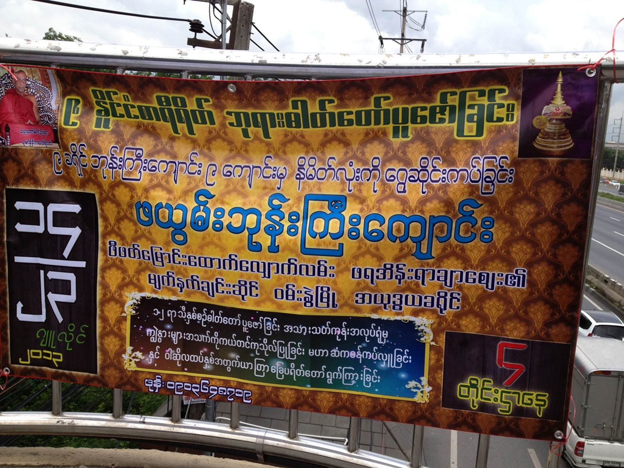 ระหว่างทางข้ามสะพานลอยเพื่อไปมหาวิทยาลัยแห่งหนึ่งในจังหวัดปทุมธานี เห็นป้ายนี้ครับ เหมือนชักชวนให้ร่วมทำบุญอะไรสักอย่าง ไม่แน่ใจว่าภาษาพม่าหรือมอญครับ แต่อยากรบกวนให้ช่วยแปลหน่อยครับ