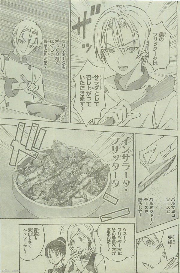 -แต่ทาคุมิก็บอกว่าไม่ใช่ เพราะฟริตตาต้าของเขาต้องกินคู่กับอินซาลาต้า(สลัดภาษาอิตาเลี่ยน)เริ่มจากการยี้ไข่ให้แตกเป็นชิ้นเล็กๆแล้วใส่ผักสลัดลงไป จากนั้นเติมบัลซามิก(น้ำส้มสายชูหมักในถังไม้โอ๊ควัตถุดิบสำคัญของอาหารอิตาเลี่ยนจะออกรสเปรี้ยวฝาดหน่อยๆ)แล้วก็ขูดพาร์เมซานชีส(ชีสที่นิยมใช้ในอาหารอิตาเลี่ยน ปกตินิยมเอามาใส่ผสมลงในพาสต้าไม่ก็รีซอสโต้ หรือโรยหน้าลาซานญ่าเพื่อให้เกิดหน้าไหม้ มีรสชาติค่อนข้างเค็มไม่มีความหนืด)ลงไป เพียงเท่านี้อาหารของทาคุมิ อินซาลาต้าฟริตตาต้า(สลัดไข่)ก็เสร็จเรียบร้อย ซึ่งบริการสองสาวดูจากประทับใจมากเนื่องจากวิธีการกินที่แปลกใหม่แถมมีผักเยอะก็ดีต่อสุขภาพ