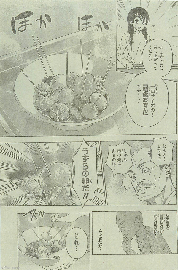 -เมงุมิกำลังเสิร์ฟอาหารไข่ของตัวเองอยู่นั่นก็คือ"โอเด้งมื้อเช้า" (โอเด้งคืออาหารญี่ปุ่นชนิดหนึ่งเป็นพวกของตุนในน้ำซุปดาชิกับโชยุ เป็นอาหารกินแก้หนาวอุ่นท้อง) ซึ่งบรรดาคุณลุงที่เป็นสปอนเซอร์จัดหาของให้โรงแรมโทสึกิก็เข้ามาดูอาหารของเมงุมิ แล้วก็เห็นว่าอาหารไข่ของเมงุมิมีไข่นกกระทาเป็นตัวชูโรงด้วย ซึ่งตามกฎก็ไม่ได้บังคับให้ใช้ไข่ไก่ ว่าแล้วทั้งสามคนเลยตัดสินใจลองชิมดูสักหน่อย