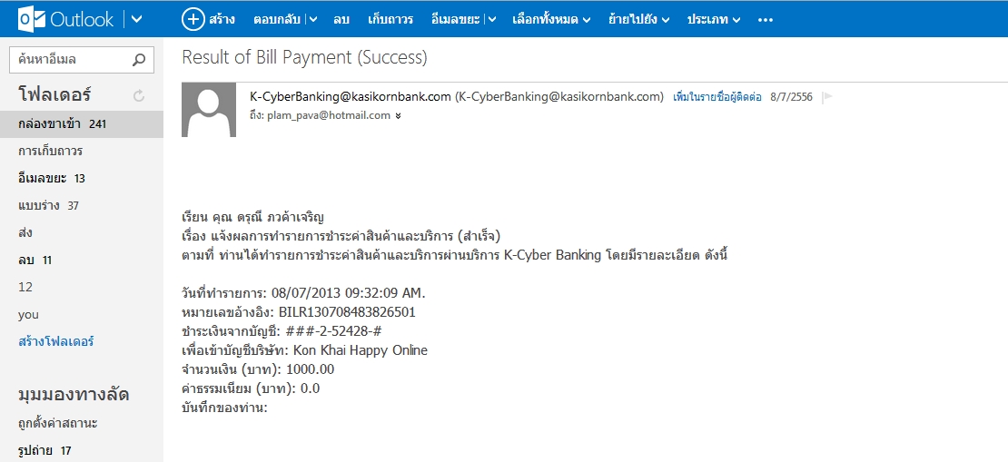 เมื่อวาน 8 ก.ค. 56 เวลาประมาณ 9.30 ได้เติมเงิน 1000 บาท เข้าคนขายแฮปปี้ออนไลน์ ผ่านระบบ Kcyber Banking ค่ะ