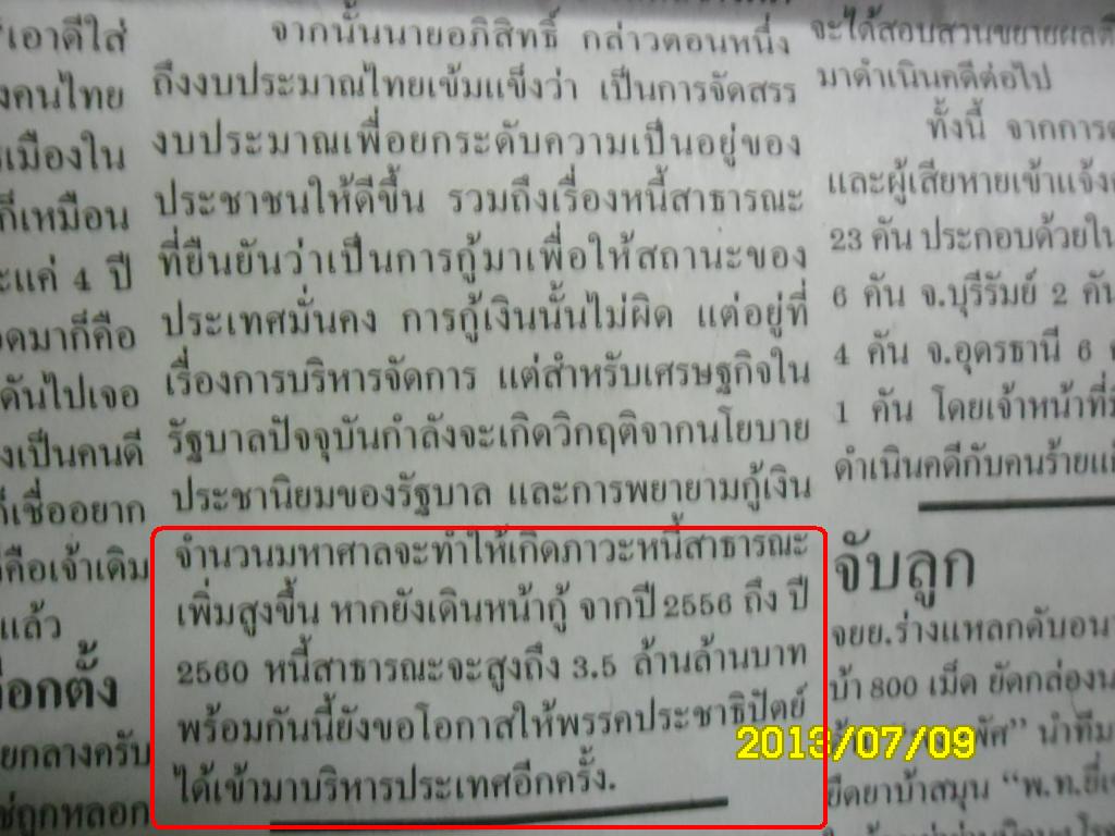 เลยไปนู่นเลย ถ้ารัฐบาลนี้กู้แบบนี้ต่อไปจนถึงปี 2560 จะมีหนี้เพิ่มขึ้น 3.5ล้านล้าน บาท