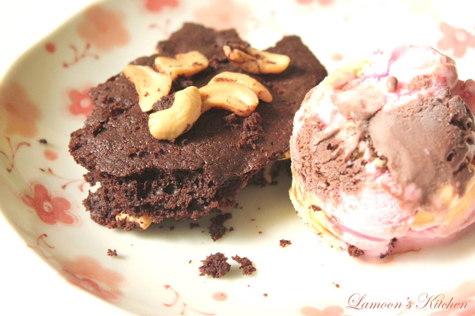 พักนี้นกกำลังสนใจชอคโกแลตค่ะ เลยหาสูตรขนมจากชอคโกแลตง่ายๆมาลองทำดู บราวนี่ชิ้นนี้ไม่หนึบค่ะ ออกจะร่วนๆ ขมๆ ถ้าทานเปล่าๆ อาจจะขมเกินไปซะด้วย เลยต้องหาไอติมมาทานคู่กัน อร่อยดีค่ะ