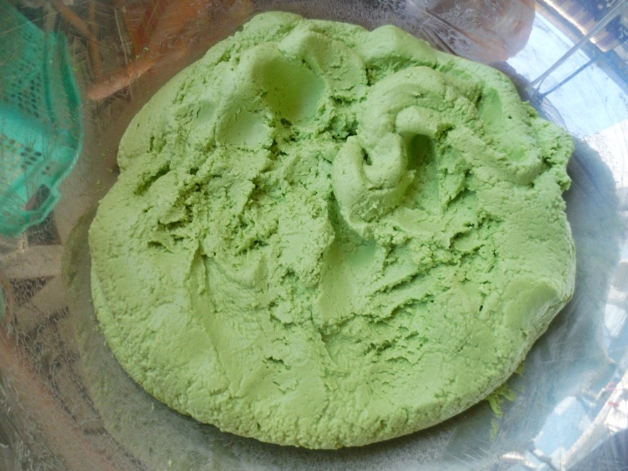 ผสมแป้งข้าวเหนียวกับน้ำใบเตย นวดจนแป้งนุ่มปั้นได้