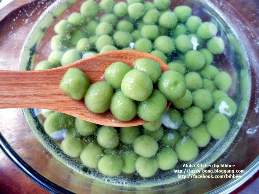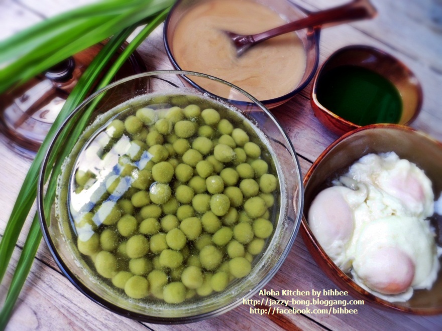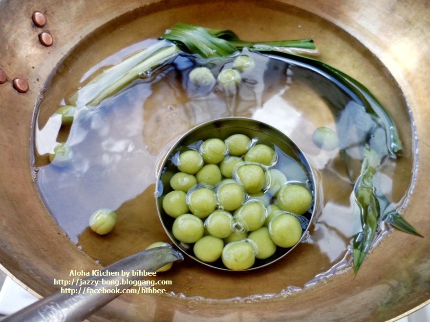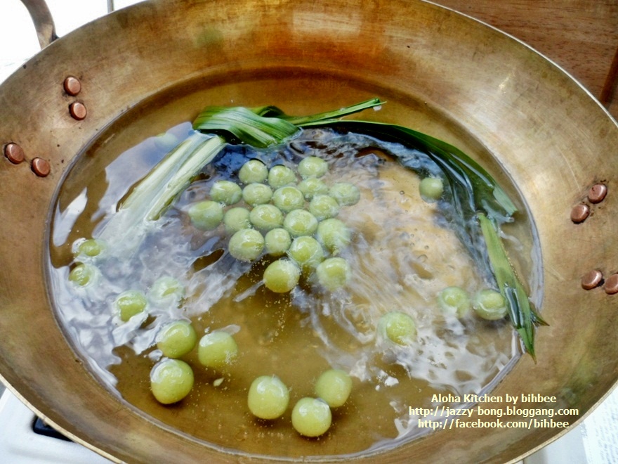 อาโลฮาคิทเช่น โดย เชฟกระทะหลุด ... สวัสดีมิตรรักแฟนรายการทุกท่านคะ ในระหว่างรอเวลาให้เนื้อที่เคี่ยวทำแกงพะแนงเปื่อย ค่าเวลาด้วยการโพสกระทู้ดีกว่า วันนี้บ่งบ๊งมีขนมไทยโบราณมาฝากชาวก้นครัว จะว่าเป็นขนมที่หากินง่าย มันก็ไม่ยากนะคะ ขนมแกงบวดใส่กะทิที่หากินง่าย มีขายกลาดเกลื่อน แต่จะให้รสชาติอร่อยล้ำถูกใจคงจะยาก นอกเสียจากต้องลงแลงลงมือทำกินเอง คนไม่ชอบทำ แต่ชอบกินก็ต้องว่า ซื้อเขากินเถอะ ทำกินเองมันยุ่งยาก เสียเวลา เอาเวลาไปทำอย่างอื่นจะเกิดประโยชน์มากกว่า ก็ว่ากันไป แต่สำหรับบ่งบ๊ง ถ้าไม่ถูกใจก็ขอยอมเหนื่อย ลงมือเอง กินแล้วมันได้อรรถรสเป็นสุขใจ พูดถึงสูตรขนมบัวลอย คงไม่ต้องไปเสริชหาที่ใด มันอยู่ในสมองขี้เลื่อยของเรา ทำกินมาตั้งแต่เป็นเด็กน้อย แบบโดยคุณย่าบังคับให้ต้องทำทุก ๆ ปิดเทอมใหญ่ประจำปี คุณย่าจะไม่ให้ออกไปวิ่งเล่นซุกซนนอกบ้าน ทำเสร็จแล้วก็ให้มาตั้งโต๊ะขายหน้าบ้าน ขนมประจำตระกูลที่ทำออกขาย อาทิ ขนมเรไร หรือรังไร ครองแครงกรอบ กรอบเค็ม แต่ที่ทำบ่อยสุดๆ ถั่วกรอบแก้ว ถั่วทอดโรยเกลือ ขนมเหนียว ขนมบัวลอย ขนมต้มเขียว ถามว่าขายดีไหม ขายไม่ดีเพราะหลาน ๆ แอบกินกันเอง แถมเอาไปแจกเพื่อนบ้านอีกด้วย ทุนหาย กำไรหด แต่คุณย่าก็ไม่ว่าอะไร ดีกว่าออกไปวิ่งเล่นนอกบ้าน เป็นสาวเป็นนาง อิอิ ครองแครงกรอบทำไปแล้ว กรอบเค็มก็ทำไปแล้ว ขนมต้มเขียวทำกินไปเรียบร้อย งั้นรอบนี้ทำขนมบัวลอย เจ้าเพื่อนยาก คนละสูตรของน้าแอ๊ด คาราบาว นะเจ้าคะ บัวลอยใบเตย ส่วนผสม แป้งข้าวเหนียว 1 ถ้วย น้ำใบเตยคั้น 1/2 ถ้วย กะทิสด 3 ถ้วย น้ำตาลทราย 1/4 ถ้วย น้ำตาลปีบ 1/4 ถ้วย เกลือ 1 ช้อนชา หมายเหตุ: น้ำใบเตยควรต้มก่อนใช้งาน ส่วนประกอบเพิ่มเตม มะพร้าวอ่อน หรือ มะพร้าวเผา มะพร้าวกะทิ ข้าวโพดต้มแกะเม็ด เผือกนึ่งหั่นชิ้นเต๋า ฯลฯ วิธีทำ ผสมแป้งข้าวเหนียวกับน้ำใบเตย นวดจนแป้งนุ่มปั้นได้ ถ้าแป้งเหลวให้เพิ่มแป้ง ถ้าแห้งไปใส่น้ำใบเตยเพิ่มไป ถ้าแป้งแฉะเล็กน้อยจะทำให้ปั้นง่าย ปั้นแล้วแป้งไม่แตก ปั้นแป้งเป็นก้อนกลม ๆ ขนาดเล็กใหญ่ก็ว่ากันไปนะคะ ตอนนี้ใบเตยที่บ้านแตกกอใหญ่มาก ใบเตยชอบพื้นที่ชื้นแฉะ ใบเตยของที่บ้านเป็นใบเตยหอมสำหรับทำขนม กลิ่นหอมมาก ๆ แค่เดินผ่านต้นก็ได้กลิ่นแล้ว ยิ่งเอามาขยำน้ำกลิ่นติดมือเลยคะ สีเขียวเข้ม ๆ กลิ่นได้ใจมาก ๆ ได้แป้งแล้วเอาผ้าขาวบางชื้น ๆ คลุมแป้ง แล้วพักไว้ก่อน แล้วเราก็มาทำน้ำกะทิน้ำตาลโตนดในแบบของเมืองเพชรบุรีกันต่อ ได้น้ำตาลโตนดของแท้มาจากเมืองเพชร ในกรุงเทพหาซื้อยากคะ ถ้าซื้อในกรุงเทพฯ รา