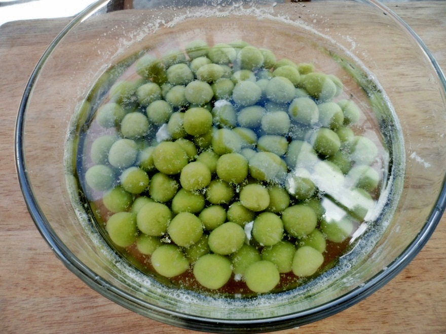 ปั้นแป้งเป็นก้อนกลม ๆ ขนาดเล็กใหญ่ก็ว่ากันไปนะคะ