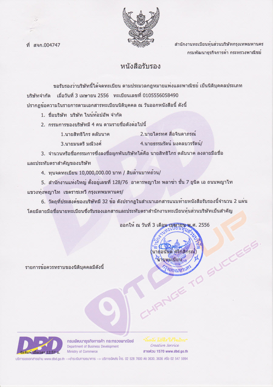 ตัวอย่างหนังสือรับรองนิติบุคคล ของกรมพัฒนาธุรกิจการค้า