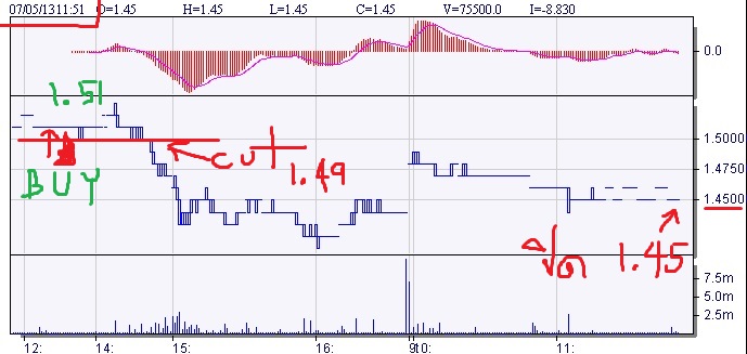 วาง stop loss ชัดเจนเช่นกันที่เห็นในรูป 1.42 เลย (โชคดีได้ของที่แนวรับพอดี ได้แล้วไม่หลุด อันนี้เป็นภาลอันประเสริฐ เพราะปกติไม่เคยรอราคาแนวรับ จะ bid เลยเท่านั้น)